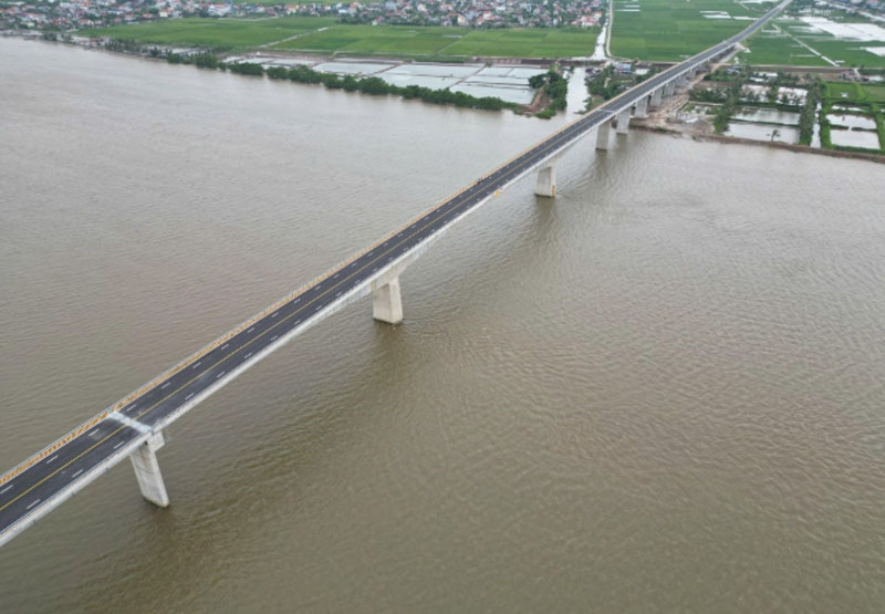 | Công trình cầu vượt sông Đáy là hạng mục trọng điểm thuộc dự án xây dựng tuyến đường bộ ven biển đoạn qua tỉnh Ninh Bình (giai đoạn I). Ảnh: THÁI BÁ |