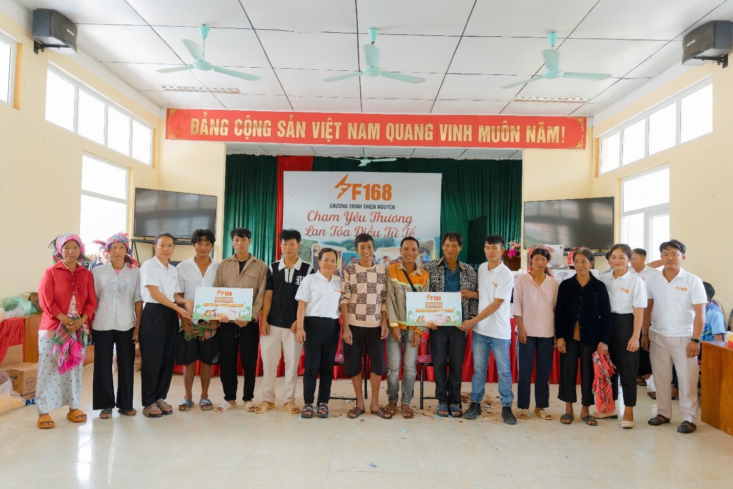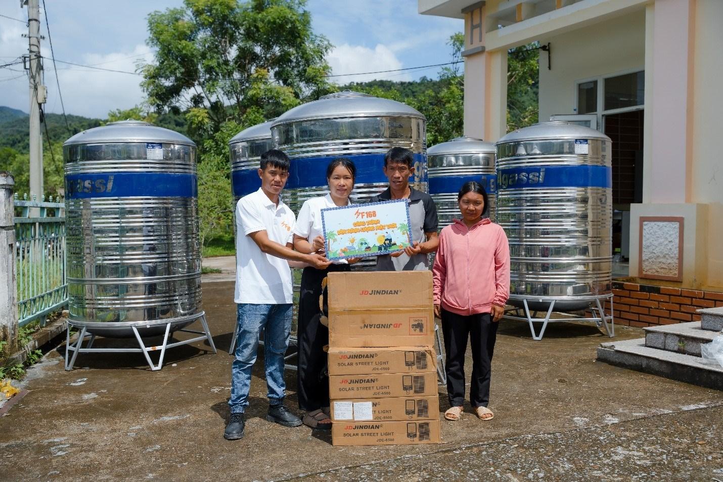 Không dừng lại ở các món quà nhỏ, Công ty TNHH Truyền thông và Giải trí F168 còn mang đến những món quà của tương lai: 5 bồn chứa nước sạch, 10 đèn năng lượng mặt trời để chiếu sáng con đường quê và 250 phần quà nhu yếu phẩm gồm gạo, mì, nước giặt, giấy vệ sinh, sữa tươi, bánh quy, bột canh, đường, tương ớt… Những món quà tuy đơn sơ nhưng chứa đựng trọn vẹn sự quan tâm, thấu hiểu và sẻ chia sâu sắc với hoàn cảnh của người dân nơi đây.