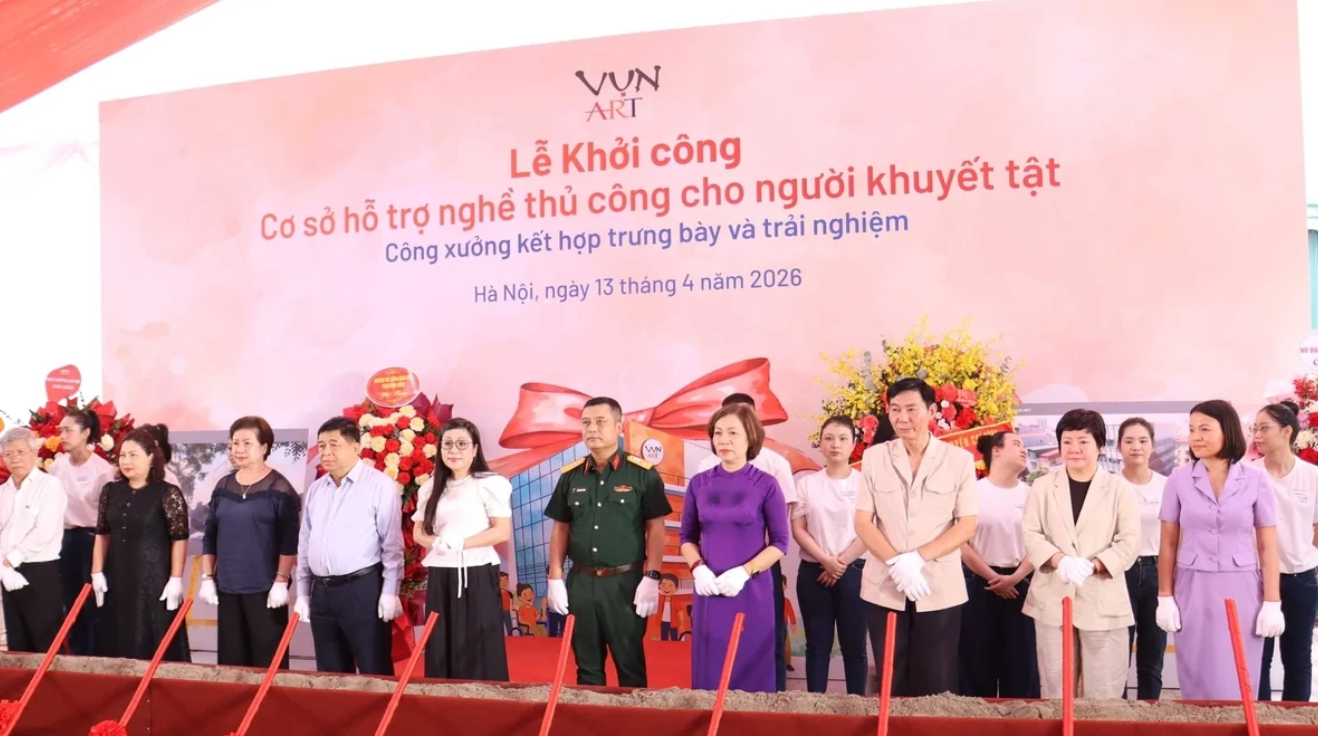 Chiều 13/4, Hợp tác xã VỤN Art tổ chức Lễ khởi công xây dựng cơ sở hỗ trợ nghề thủ công cho người khuyết tật, kết hợp công xưởng sản xuất, trưng bày và trải nghiệm sản phẩm gắn với nghề truyền thống làng lụa Vạn Phúc (phường Hà Đông, Hà Nội).