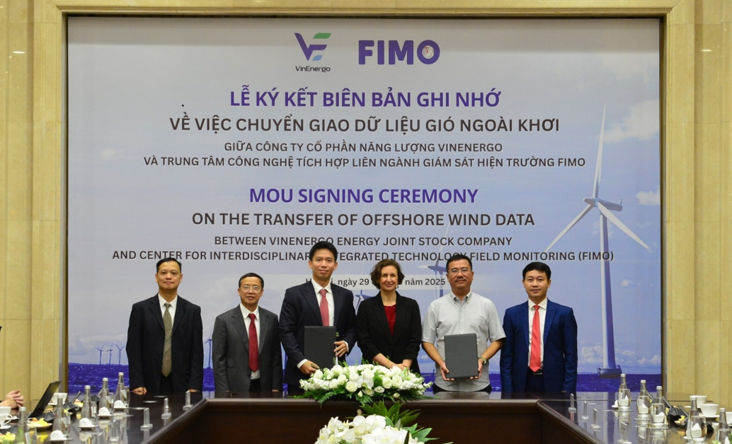 Ngày 29/9/2025, Công ty Cổ phần Năng lượng VinEnergo (Tập đoàn Vingroup) và Trung tâm FIMO (trường Đại học Công nghệ - Đại học Quốc gia Hà Nội) đã ký kết biên bản hợp tác chuyển giao bộ dữ liệu đo gió ngoài khơi đầu tiên ở Việt Nam. Đây là bước chuẩn bị quan trọng cho các dự án sản xuất điện gió quy mô lớn, góp phần đưa Việt Nam tiến gần hơn tới mục tiêu trở thành quốc gia tiên phong về năng lượng xanh trong khu vực.