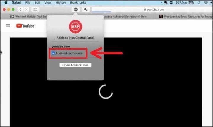 Bước 4: Bạn mở một trang web bất kỳ, ví dụ YouTube trên Safari. Ở trên cùng màn hình, bạn nhấn vào biểu tượng có chữ ABP. Sau đó, nhấn tích vào dòng Enabled on this site.