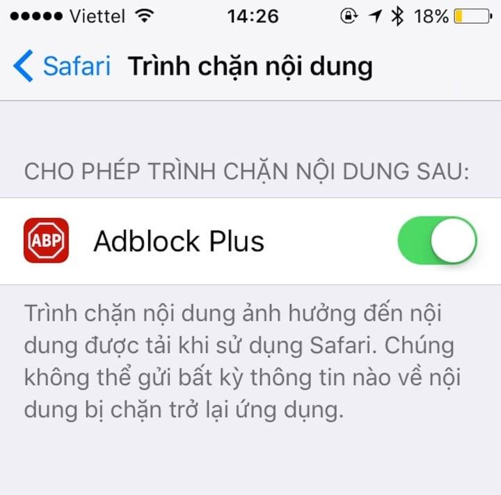 Bước 3: Nhấn chọn phần Trình chặn nội dung và cho phép kích hoạt ứng dụng chặn quảng cáo mà bạn đã tải về (ví dụ dưới đây là ứng dụng AdBlock Plus).