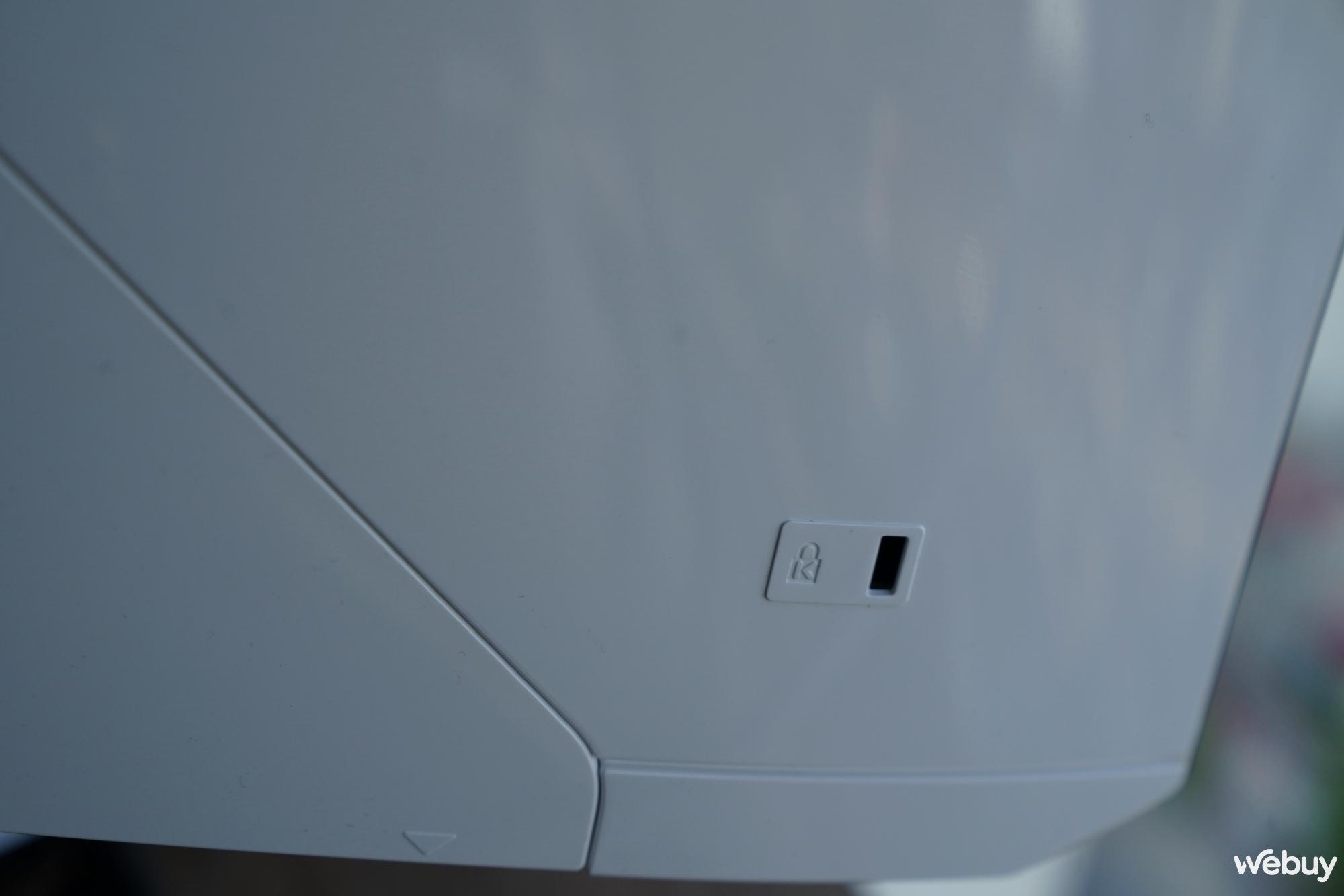 Phần lưng của Samsung Odyssey Neo G8 ấn tượng như những người anh em của mình. Đây cũng là thiết kế đặc trưng của màn hình chơi game Odyssey với phong cách tương lai và màu trắng làm chủ đạo. Trải dài phía trên là khe tản nhiệt cho tấm nền cỡ lớn. Ngoài ra là logo Odyssey bên trái và lỗ khóa Kensington ở góc phải phía dưới. Phía dưới là các cổng kết nối được che bởi tấm nhựa cỡ lớn để tăng tính thẩm mỹ.