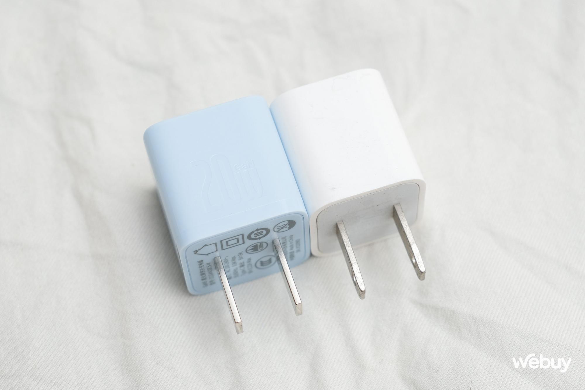 So sánh nhanh với củ sạc 5W của Apple, kích thước của củ sạc Baseus 20W chỉ nhỉnh hơn một chút dù có công suất lớn hơn nhiều. Do có kích thước nhỏ, Baseus sử dụng chân dẹt cố định chứ không phải chân gập như các sản phẩm công suất cao. Thiết kế cố định này cũng giúp chân sạc có độ bền cao hơn trong quá trình sử dụng