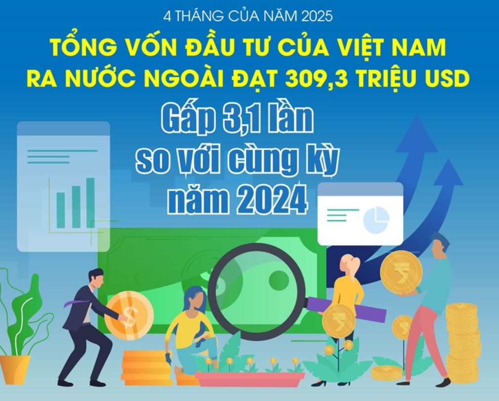 Tổng vốn đầu tư của Việt Nam ra nước ngoài (vốn cấp mới và điều chỉnh) đạt 309,3 triệu USD trong 4 tháng đầu năm 2025, gấp 3,1 lần so với cùng kỳ năm 2024.