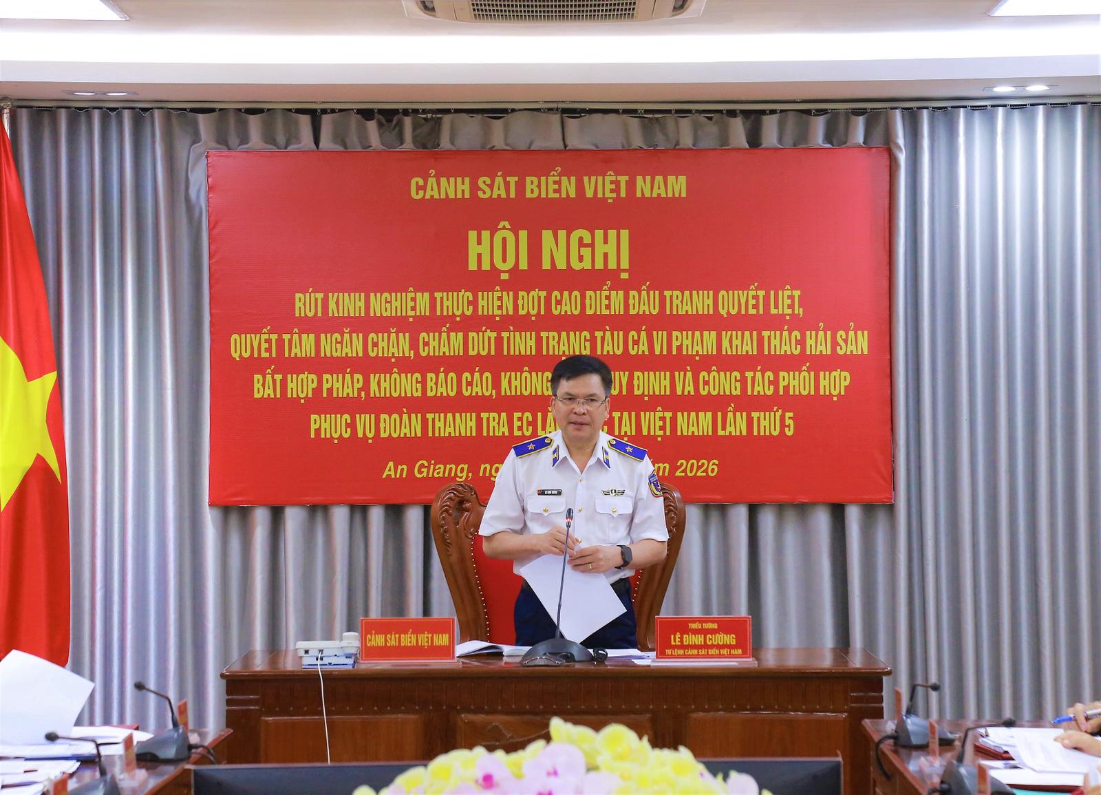Phát biểu kết luận hội nghị, Thiếu tướng Lê Đình Cường, Tư lệnh Cảnh sát biển Việt Nam nhấn mạnh: Đợt cao điểm đấu tranh chống khai thác IUU thời gian qua đã đạt được những kết quả quan trọng, tạo chuyển biến rõ nét về nhận thức và hành động của các cấp, các ngành, địa phương và ngư dân. Tình trạng tàu cá vi phạm vùng biển nước ngoài từng bước được kiềm chế, góp phần nâng cao uy tín quốc gia trong thực hiện cam kết quốc tế, đặc biệt là đối với EC.