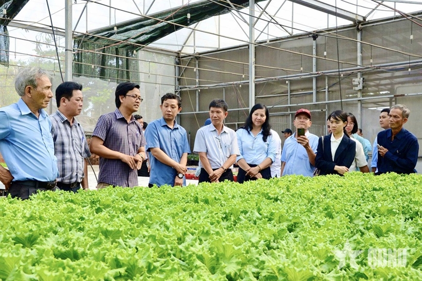 | Trao đổi kỹ thuật trồng rau tại Hợp tác xã Tuấn Ngọc, phường Long Trường. |
