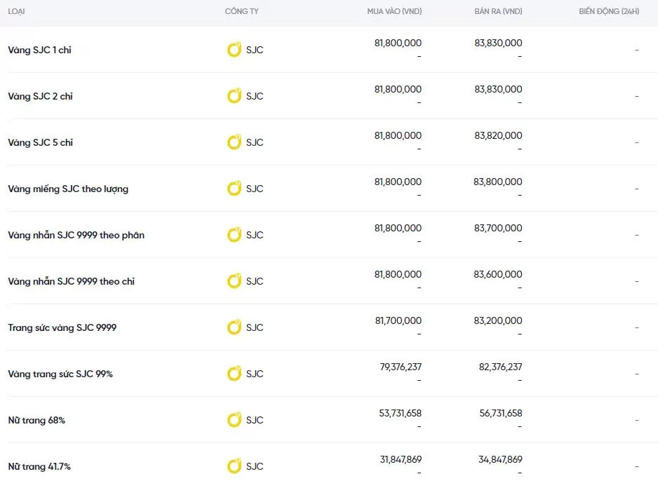 Vàng miếng SJC giao dịch ở mức 81,8-83,8 triệu đồng/lượng, không thay đổi so với phiên giao dịch ngày hôm qua. |