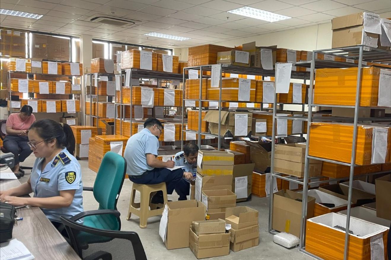 Lực lượng Quản lý thị trường kiểm tra hàng hóa tại Công ty TNHH Tiger Display Global (Mê Linh, Hà Nội). Ảnh: QLTT