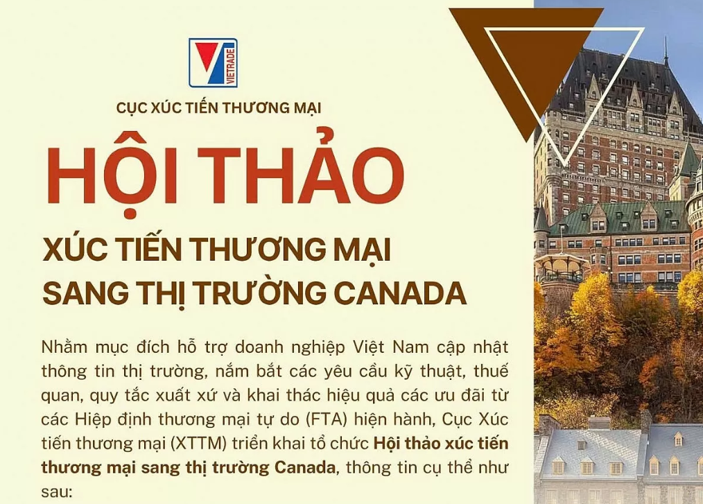 Nhằm hỗ trợ doanh nghiệp Việt Nam khai thác hiệu quả các ưu đãi từ các Hiệp định thương mại tự do (FTA), đặc biệt là Hiệp định Đối tác Toàn diện và Tiến bộ xuyên Thái Bình Dương (CPTPP), Trung tâm Hỗ trợ Xúc tiến thương mại và đầu tư (Promocen) - Cục Xúc tiến thương mại, Bộ Công Thương sẽ tổ chức Hội thảo xúc tiến thương mại sang thị trường Canada vào ngày 06/6/2025, theo hình thức trực tuyến kết nối các đầu cầu tại Việt Nam và Canada thông qua nền tảng Zoom.