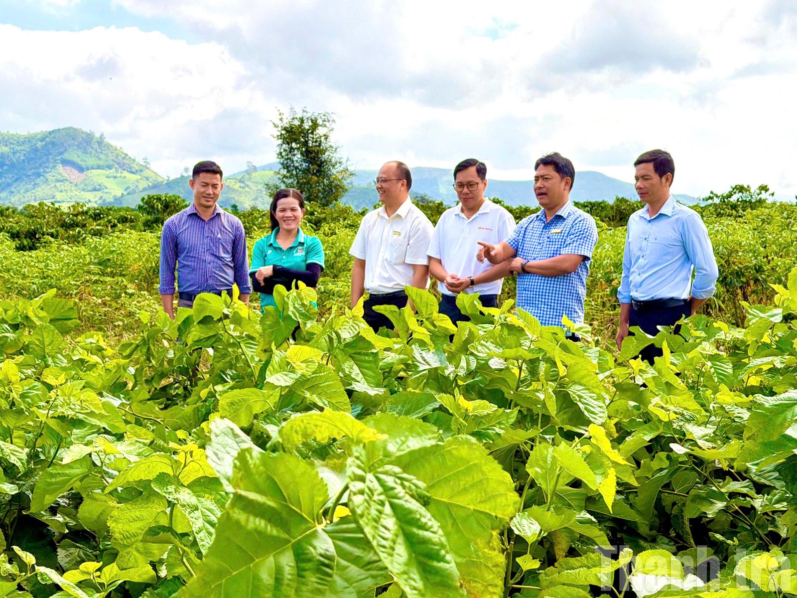 Cán bộ địa phương và đại diện HTX Dịch vụ nông nghiệp dâu tằm tơ Hòa Lễ tham quan mô hình trồng dâu siêu lá tại thôn 29, xã Krông Bông, Đắk Lắk. Việc phát triển vùng nguyên liệu dâu tằm với giống năng suất cao là nền tảng vững chắc cho chuỗi liên kết sản xuất tơ tằm bền vững. Ảnh: NG