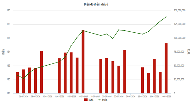 Chỉ số UPCoM-Index kết thúc phiên giao dịch tháng đầu tiên của năm 2026 đạt 129,06 điểm, tăng 8,09 điểm (6,68%) so với cuối tháng 12/2025. Khối lượng giao dịch bình quân đạt 80,22 triệu cổ phiếu/phiên, tăng 61,7% so với tháng trước, tương ứng giá trị giao dịch (GTGD) bình quân đạt hơn 1.654 tỷ đồng/phiên, tăng 96,69%.