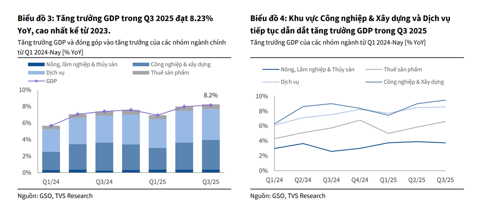 Khu vực Nông, lâm nghiệp và thủy sản cũng ghi nhận kết quả tích cực với mức tăng 3,9%, đóng góp hơn 5% vào tăng trưởng chung. Nhờ đó, GDP quý III/2025 vượt xa kỳ vọng, khiến TVS Research nâng dự báo tăng trưởng cả năm lên 8,0–8,2%, cao hơn mức dự báo trước đó.