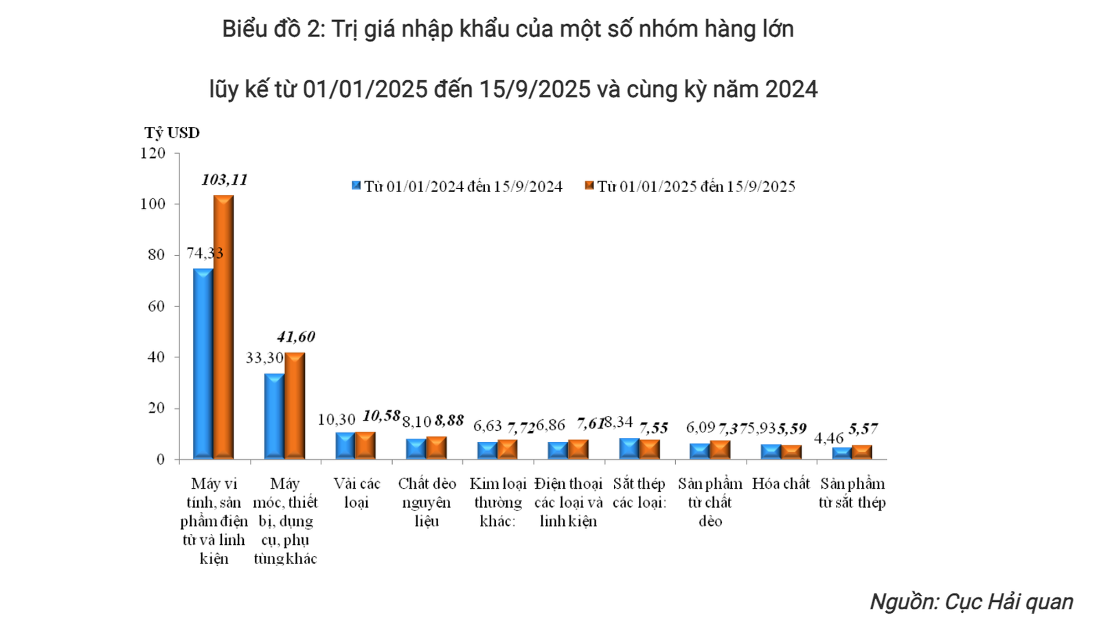 Trị giá nhập khẩu hàng hóa trong kỳ 1 tháng 9/2025 tăng so với kỳ 2 tháng 8/2025 chủ yếu ở một số nhóm hàng sau: Máy vi tính, sản phẩm điện tử và linh kiện tăng 265 triệu USD, tương ứng tăng 3,9%; máy móc, thiết bị, dụng cụ và phụ tùng tăng 191 triệu USD, tương ứng tăng 7,5%.