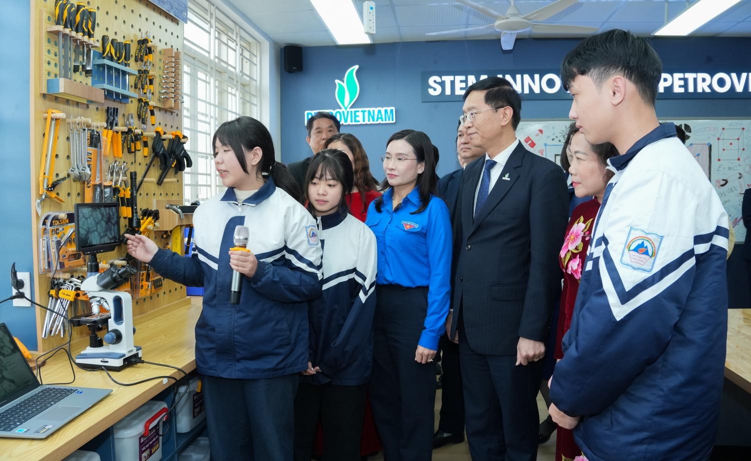 Không dừng lại ở việc hỗ trợ vật chất, Petrovietnam còn đặc biệt chú trọng đầu tư cho thế hệ trẻ - những chủ nhân tương lai của đất nước. Trong khuôn khổ chuỗi hoạt động, đoàn công tác Petrovietnam đã dự lễ khánh thành 3 phòng thực hành giáo dục STEM tại Trường THPT chuyên Cao Bằng, Trường THPT Quảng Uyên và Trường THCS Đề Thám. Đây là những công trình thuộc chương trình STEM Innovation Petrovietnam, được Tập đoàn triển khai tại 34 tỉnh, thành phố trên cả nước.