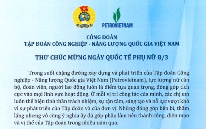 Thư chúc mừng Ngày Quốc tế Phụ nữ 8/3 của Chủ tịch Công đoàn Petrovietnam