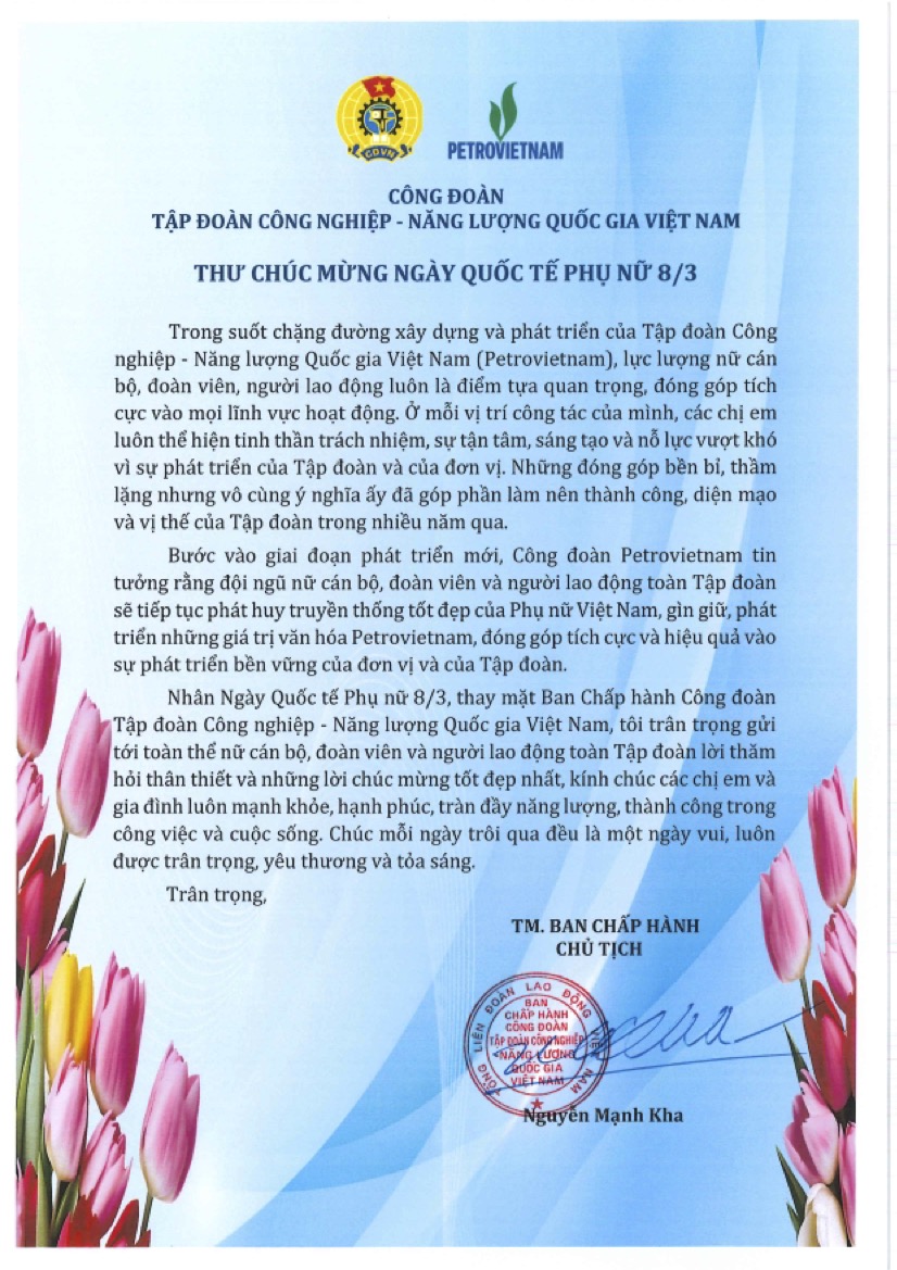 Nhân dịp Ngày Quốc tế Phụ nữ 8/3, Chủ tịch Công đoàn Petrovietnam Nguyễn Mạnh Kha gửi Thư chúc mừng tới toàn thể nữ cán bộ, đoàn viên và người lao động Petrovietnam.