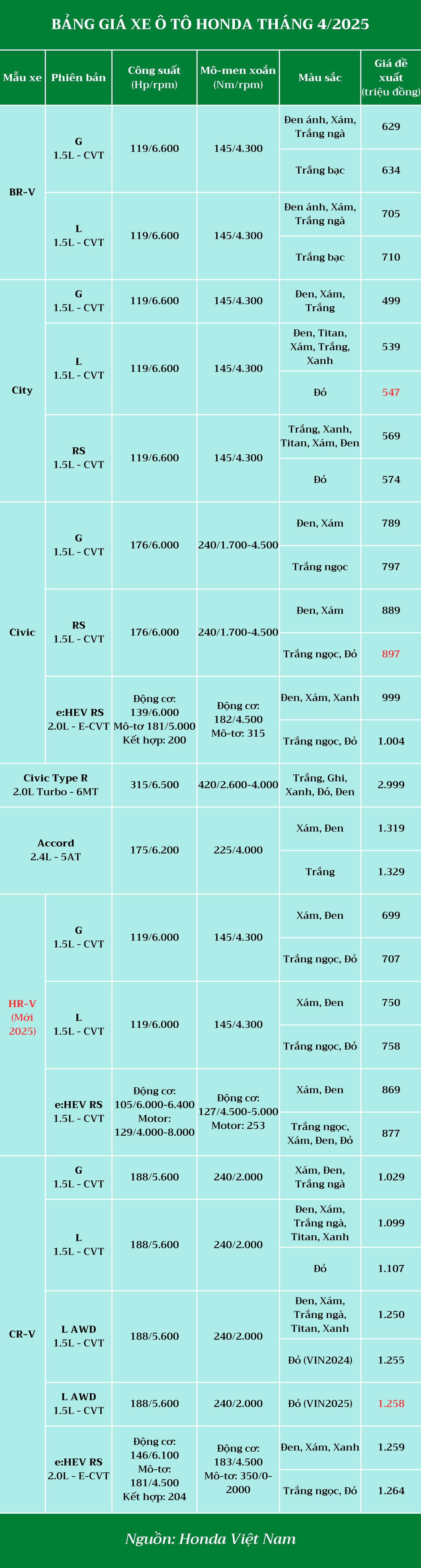 Thêm một chi tiết khác biệt trong bảng giá ô tô Honda cập nhật tháng 4 là các mẫu xe City, Civic và CR-V có ngoại thất màu đỏ đều tăng giá nhẹ thêm 3 triệu đồng so với tháng trước.