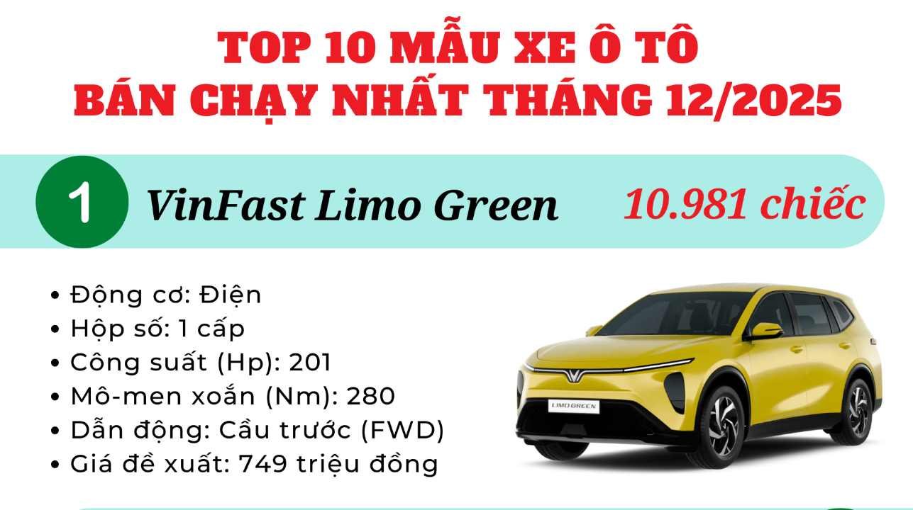 Top 10 ô tô bán chạy nhất tháng 12/2025: Đỉnh bảng cho VinFast Limo Green
