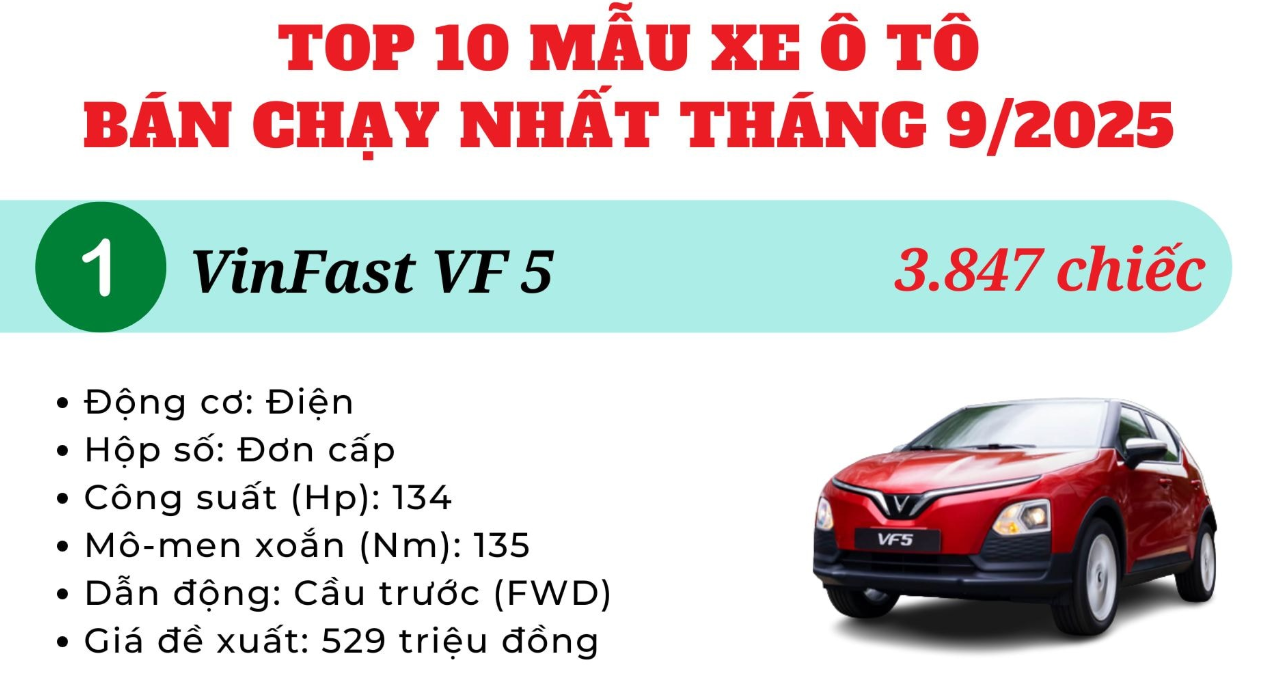 Top 10 ô tô bán chạy nhất thị trường Việt Nam tháng 9/2025