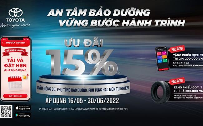 Hỗ trợ giảm 15% trên giá bán lẻ dầu động cơ, phụ tùng bảo dưỡng và phụ tùng hao mòn tự nhiên cho tất cả các khách hàng cài đặt ứng dụng Toyota Vietnam cùng nhiều ưu đãi về dịch vụ. Toyota Việt Nam chiều lòng khách hàng Việt với chương trình ưu đãi dịch vụ “An tâm bảo dưỡng - Vững bước hành trình”.
