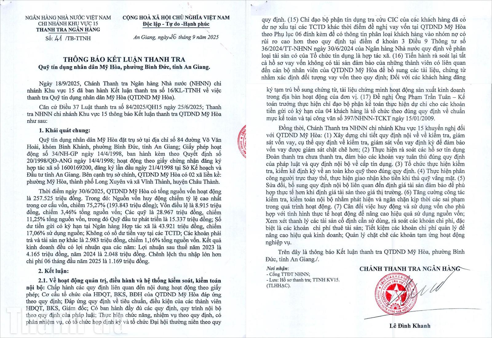 Thông báo kết luận thanh tra của Thanh tra Ngân hàng Nhà nước Chi nhánh khu vực 15. Ảnh: Cảnh Nhật