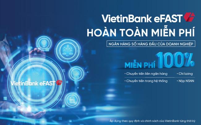 Năm 2022, VietinBank tiếp tục tung gói ưu đãi miễn phí dành cho các doanh nghiệp sử dụng Ngân hàng số VietinBank eFAST. Cụ thể, khách hàng khi giao dịch online trên ngân hàng số VietinBank eFAST sẽ được miễn 100% phí giao dịch chuyển tiền VNĐ (bao gồm phí chuyển tiền VND trong và ngoài hệ thống, phí chi lương, phí nộp ngân sách nhà nước); Giảm 50% phí chuyển tiền ngoại tệ và áp dụng tỷ giá ưu đãi tới 80 điểm tùy cặp đồng tiền.