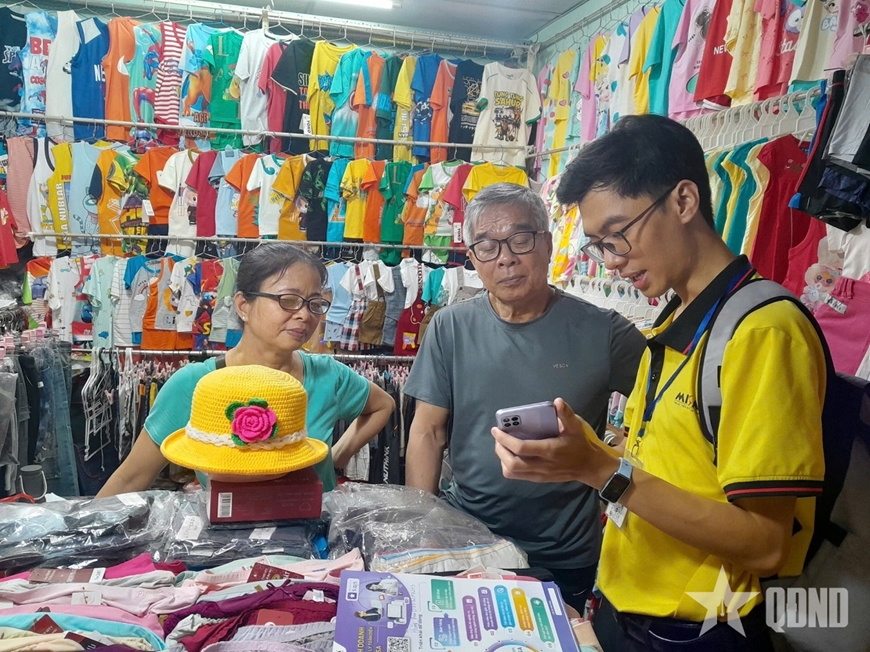 Nhân viên Công ty Cổ phần MISA tư vấn hộ kinh doanh về phần mềm kê khai nộp thuế cài đặt trên điện thoại thông minh. Ảnh: HÀ TRANG |