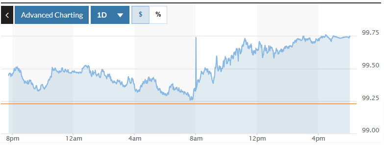 Biểu đồ biến động Chỉ số DXY trong 24 giờ qua. Ảnh: Market watch |