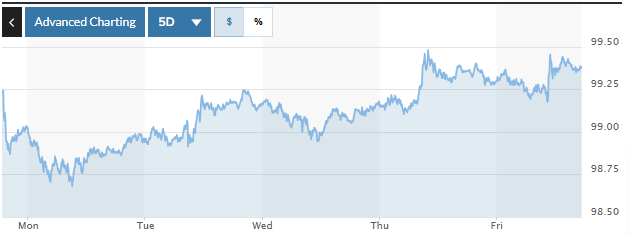 Chỉ số USD Index (DXY), đo lường biến động đồng bạc xanh với 6 đồng tiền chủ chốt, tăng tuần 0,24%, lên mức 99,38.