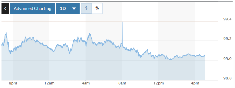 Biểu đồ biến động Chỉ số DXY trong 24 giờ qua. Ảnh: Market watch |