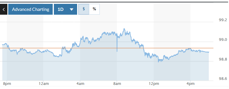 Trong khi đó, trên thị trường Mỹ, chỉ số US Dollar Index (DXY) đo lường biến động đồng bạc xanh với 6 đồng tiền chủ chốt (EUR, JPY, GBP, CAD, SEK, CHF) giảm 0,05%, hiện ở mức 98,89.