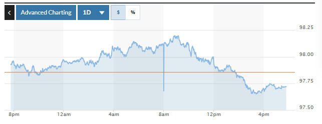 | Biểu đồ biến động Chỉ số DXY trong 24 giờ qua. Ảnh: Marketwatch |