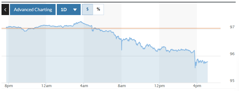Biểu đồ biến động Chỉ số DXY trong 24 giờ qua. Ảnh: Market watch |