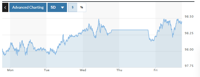 Chỉ số USD Index (DXY) đo lường biến động đồng bạc xanh với 6 đồng tiền chủ chốt tăng tuần 0,47%, hiện ở mức 98,43.