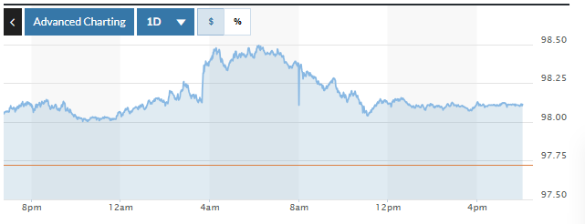 Biểu đồ biến động Chỉ số DXY trong 24 giờ qua. Ảnh: Marketwatch