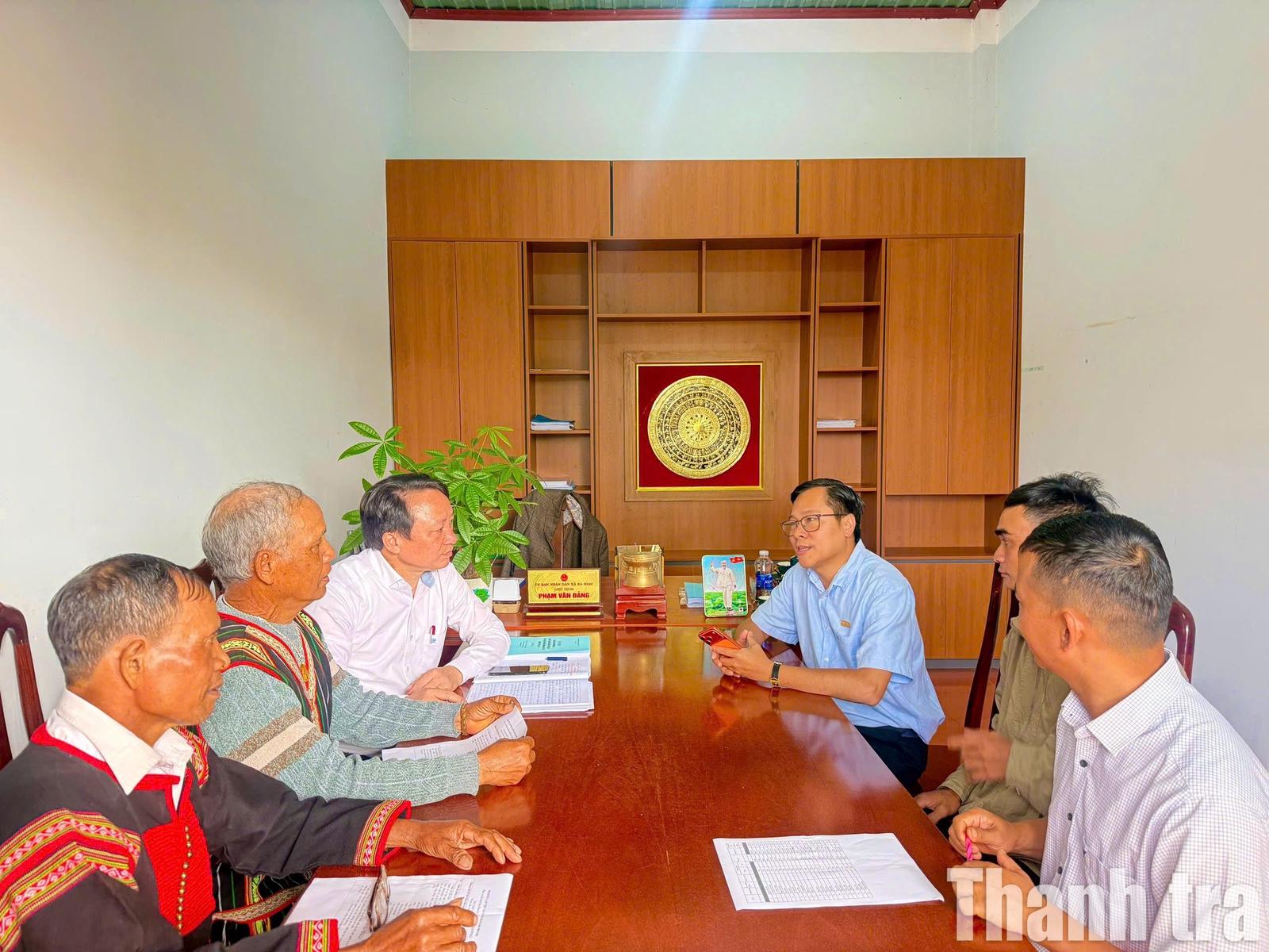 Người có uy tín Phạm Văn Bảo (SN 1955, dân tộc Thái, ở thôn Thái, xã Ea Hiao, Đắk Lắk) trao đổi với cán bộ địa phương, phát huy vai trò cầu nối quan trọng giữa chính quyền và đồng bào ở xã Ea Hiao. Ảnh: NG