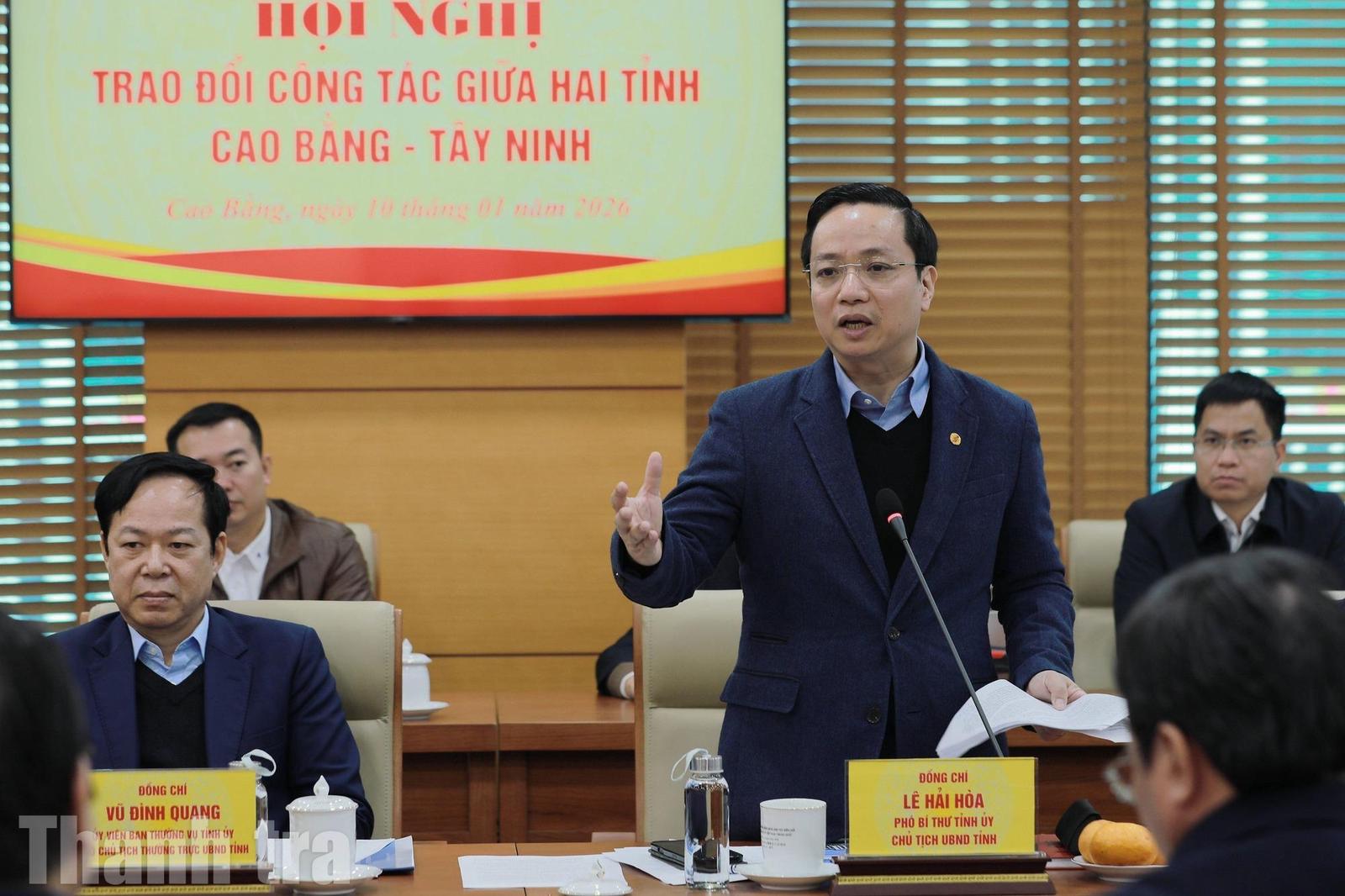 Chủ tịch UBND tỉnh Cao Bằng Lê Hải Hoà phát biểu tại buổi làm việc với đoàn công tác tỉnh Tây Ninh. Ảnh: Thanh Giang.