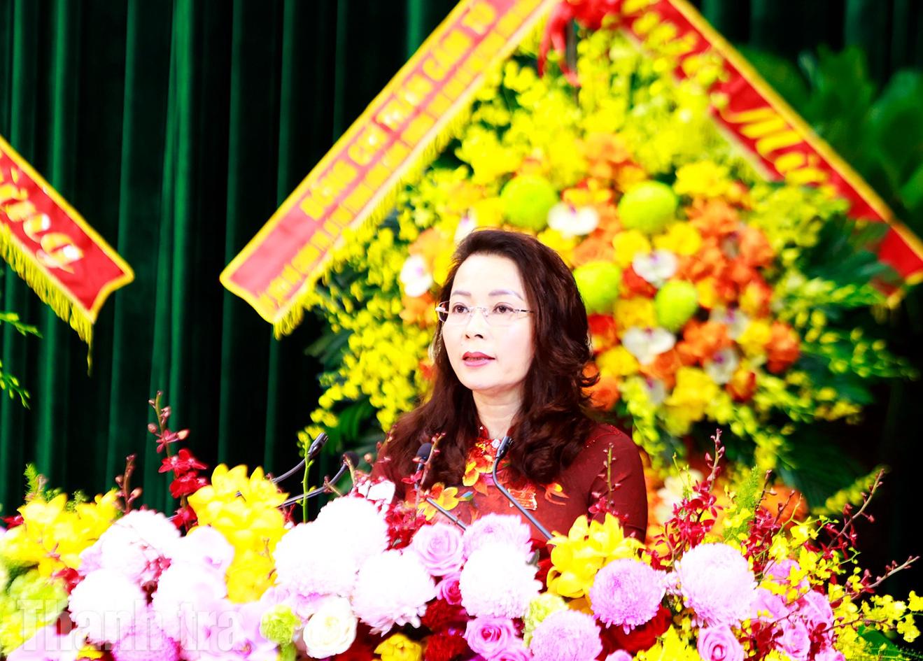 Phó Bí thư Thường trực Tỉnh ủy Nguyễn Thị Hương trình bày báo cáo chính trị trình Đại hội. Ảnh: PV