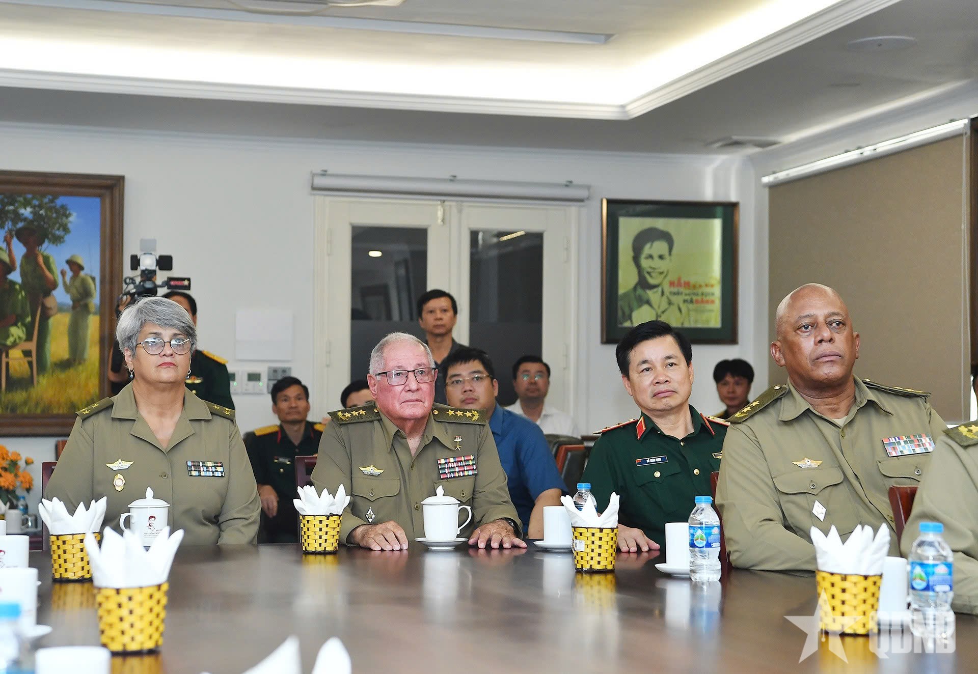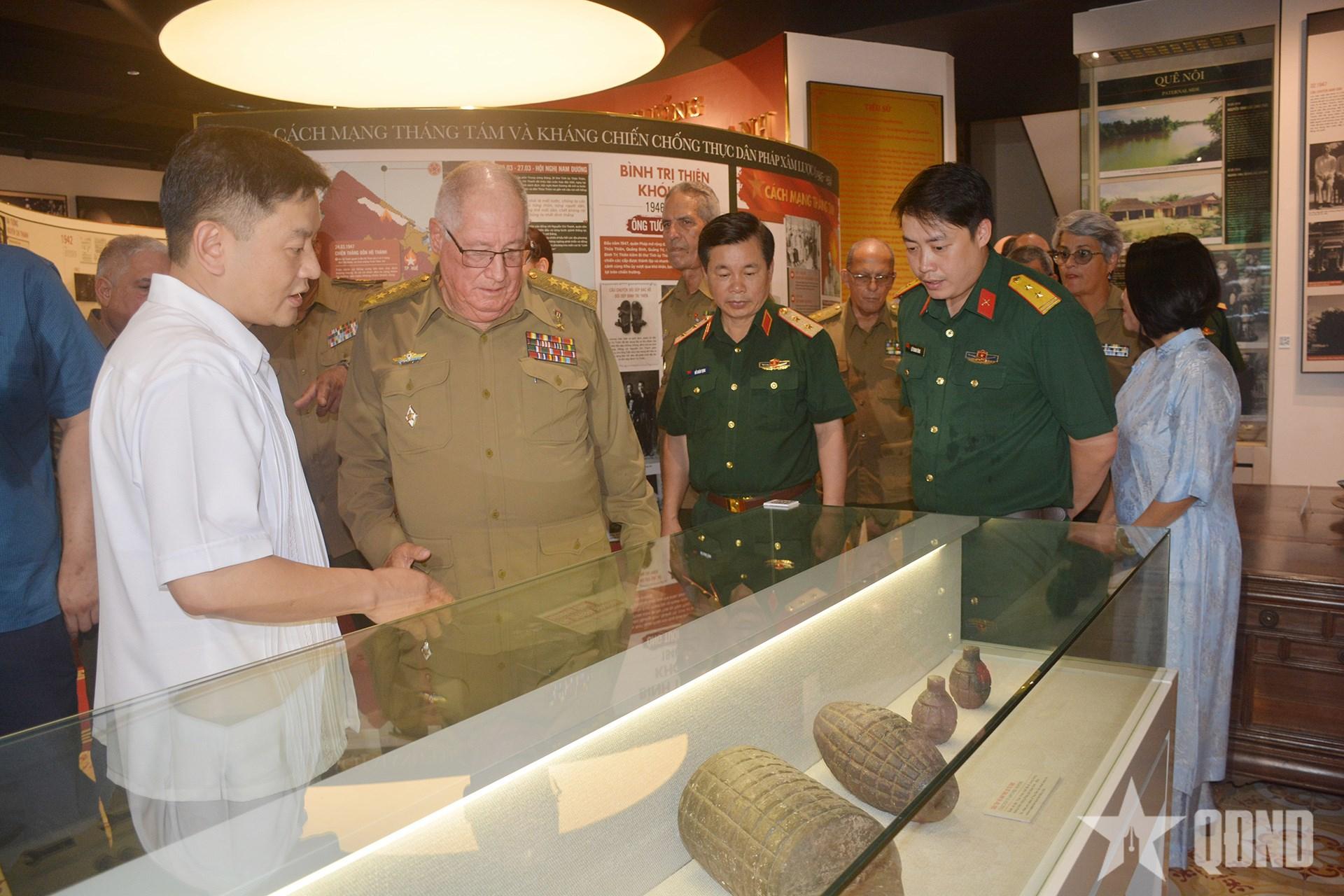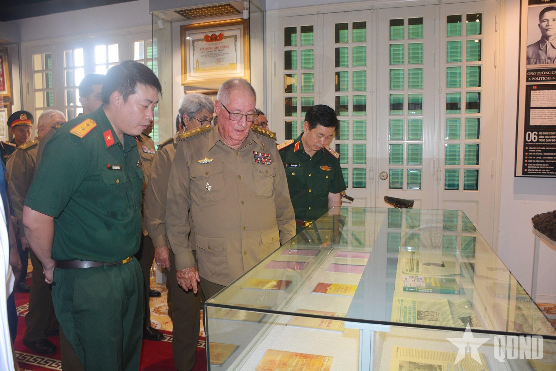 | Thượng tướng Álvaro López Miera và Trung tướng Đỗ Xuân Tụng cùng đoàn xem những bức ảnh, tư liệu, hiện vật và cuốn sách được trưng bày tại Bảo tàng. |
