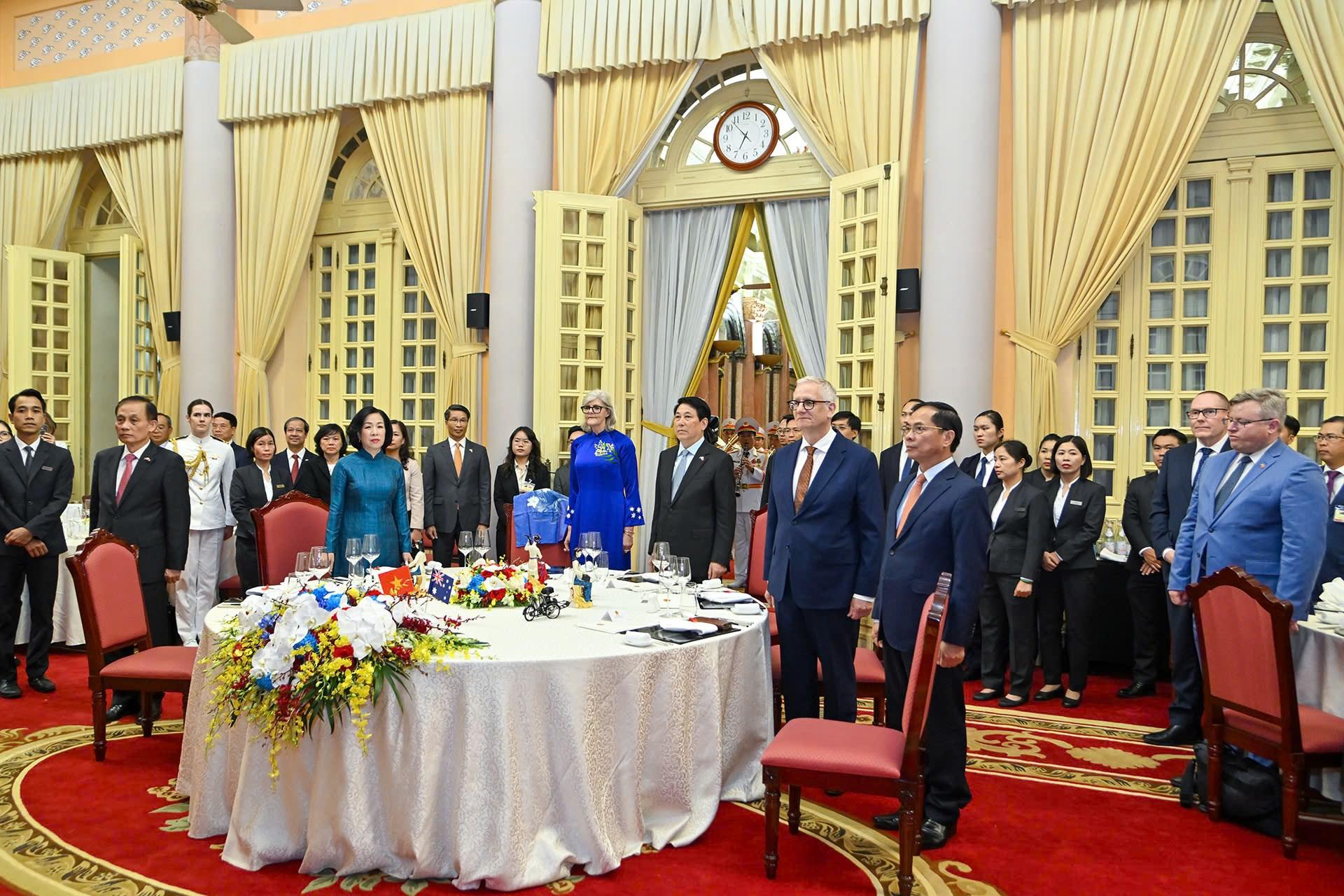 Chủ tịch nước Lương Cường và phu nhân cùng Toàn quyền Sam Mostyn và phu quân cùng các đại biểu tại chiêu đãi. |