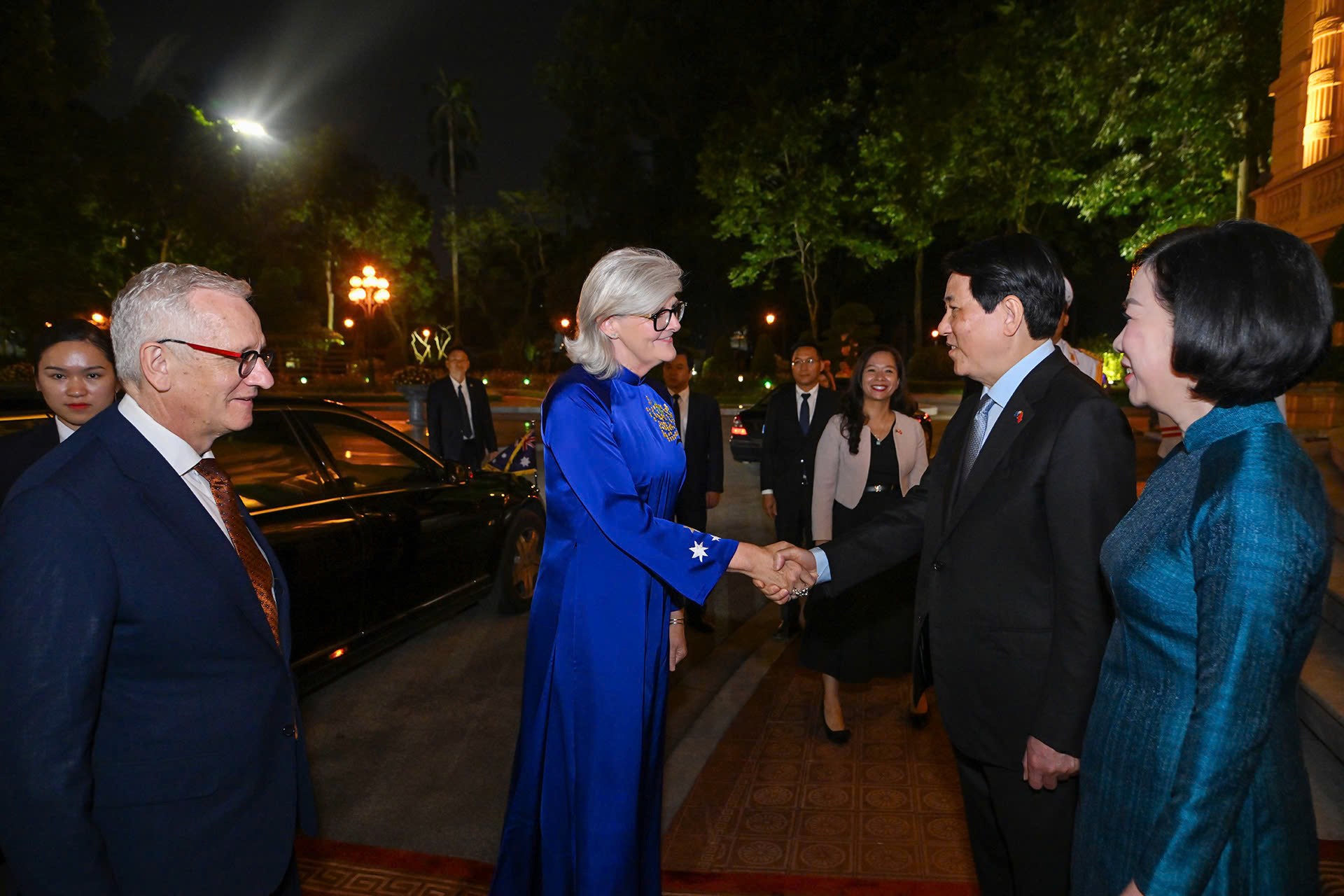 Chủ tịch nước Lương Cường chào đón Toàn quyền Australia Sam Mostyn. |