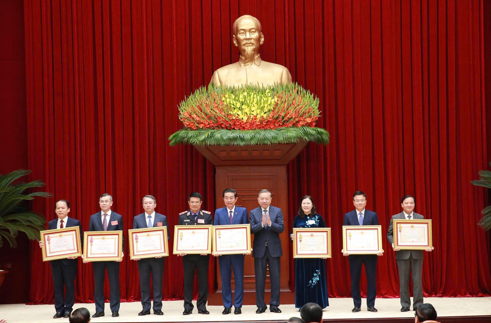 Tổng Bí thư trao tặng phần thưởng cao quý cho Chủ tịch nước Lương Cường và nhiều lãnh đạo Đảng, Nhà nước. Ảnh: Báo Nhân dân