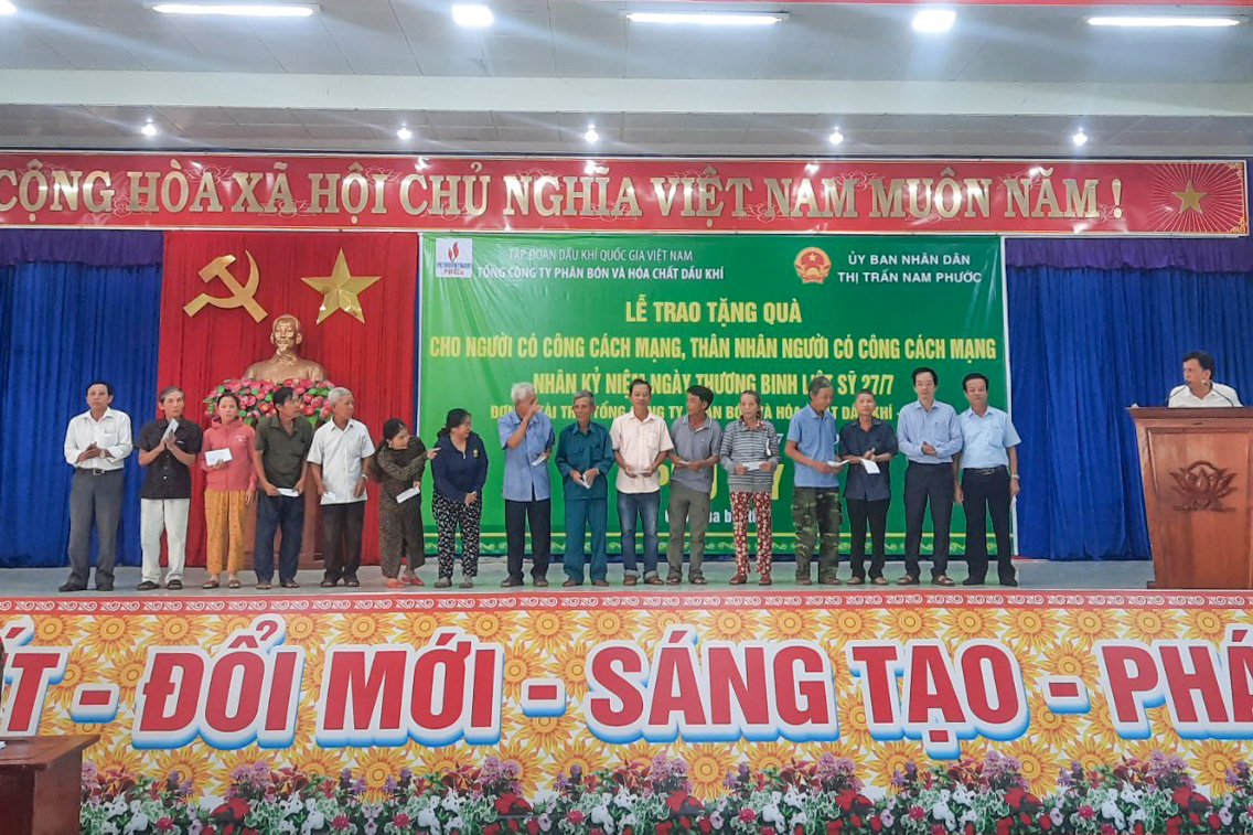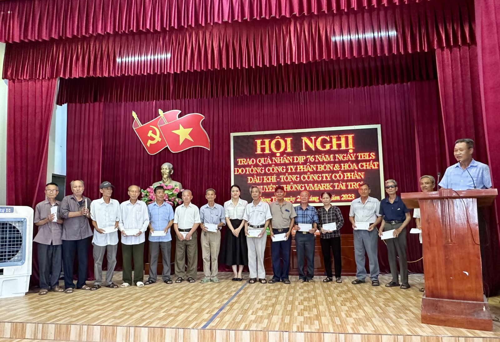 Cũng trong chiều ngày 25/7, Bà Đỗ Thị Phượng – Phó Tổng Giám đốc Công ty cùng đại diện Tổng Công ty Phân bón và Hóa chất Dầu khí phối hợp với UBND xã Đông Tân, huyện Đông Hưng, tỉnh Thái Bình tổ chức buổi gặp mặt, trao tặng 200 suất quà với tổng giá trị 200.000.000 đồng, mỗi đơn vị trao 100.000.000 đồng cho các đối tượng chính sách trên địa bàn xã.