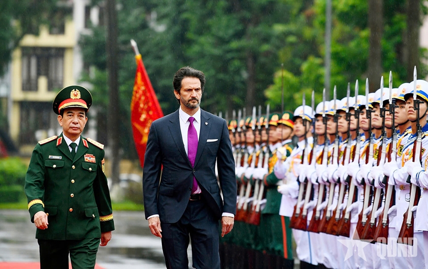 | Đại tướng Phan Văn Giang và Phó thủ tướng, Bộ trưởng Bộ Quốc phòng Slovakia Robert Kalinak duyệt Đội danh dự Quân đội nhân dân Việt Nam. Ảnh: TUẤN HUY |