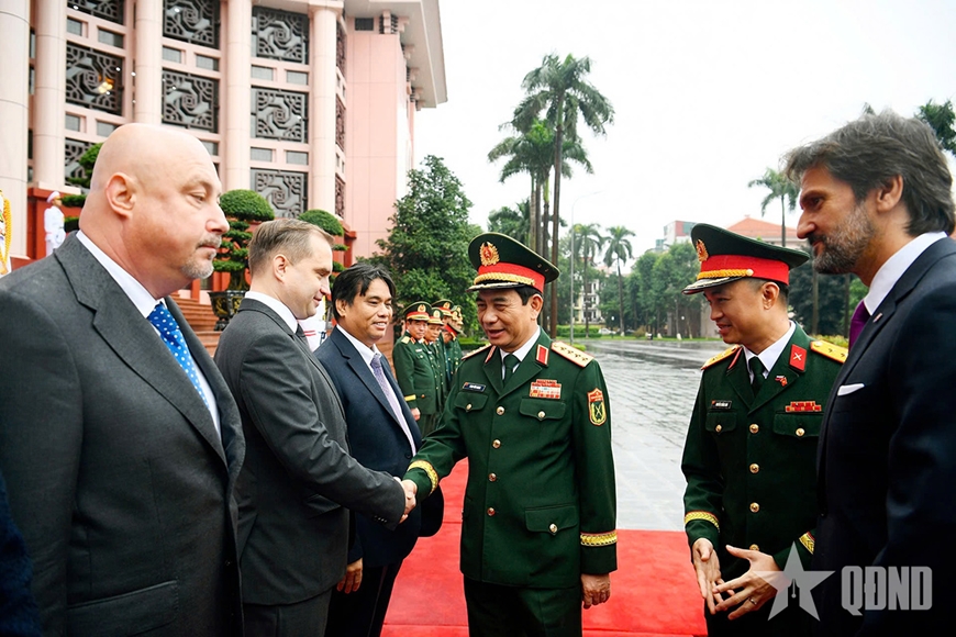Đại tướng Phan Văn Giang đón Phó thủ tướng, Bộ trưởng Bộ Quốc phòng Slovakia Robert Kalinak. Ảnh: TUẤN HUY |