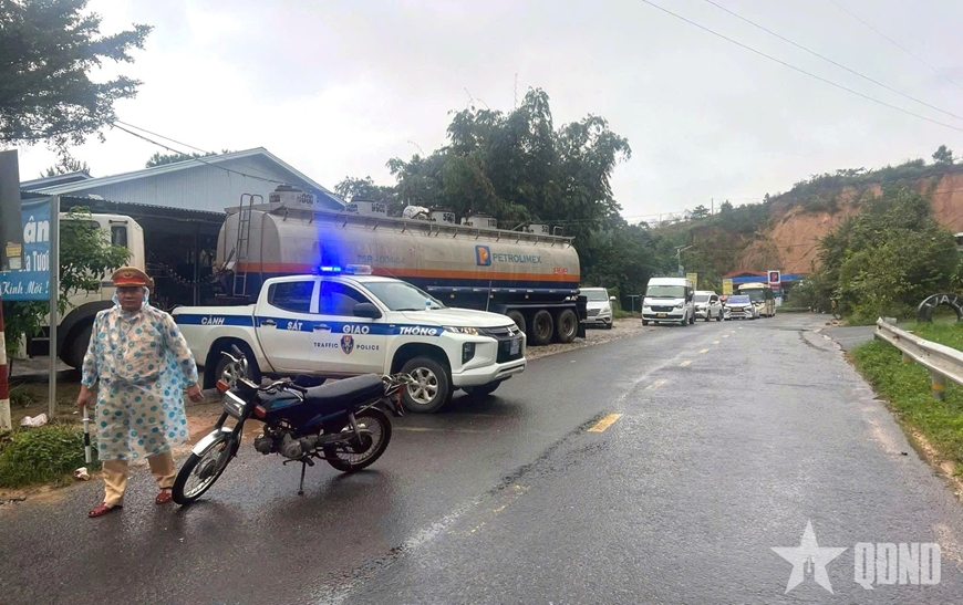 Lực lượng cảnh sát giao thông Công an tỉnh Lâm Đồng phân luồng giao thông tại khu vực đèo Ngoạn Mục trưa 19-11. Ảnh CTV |