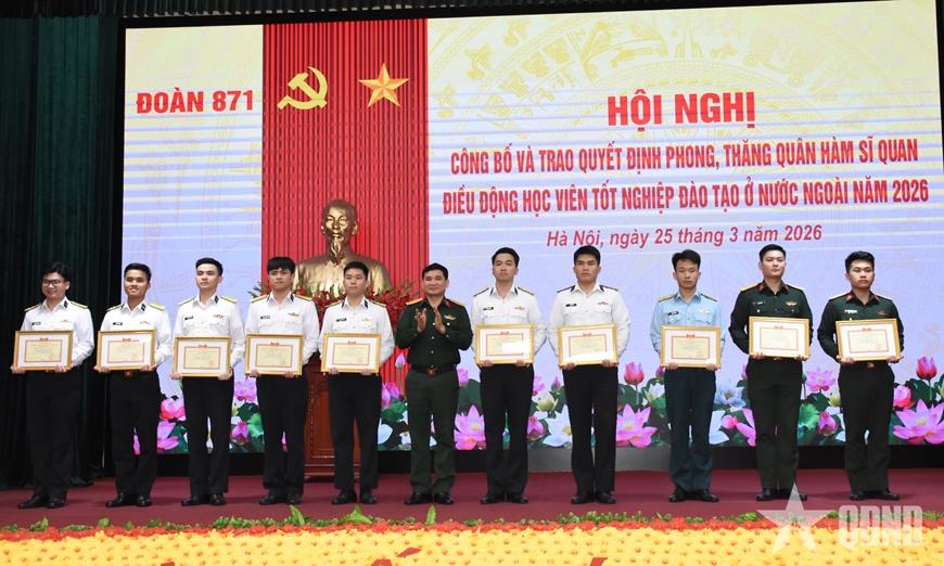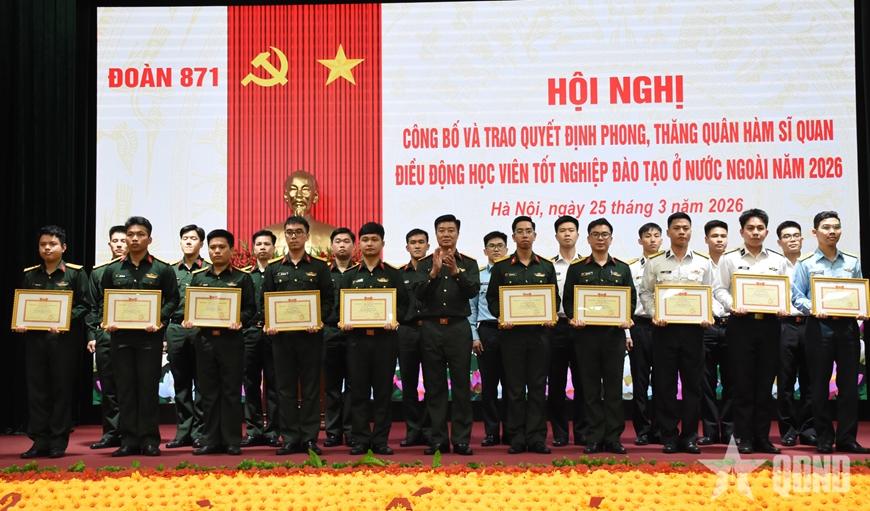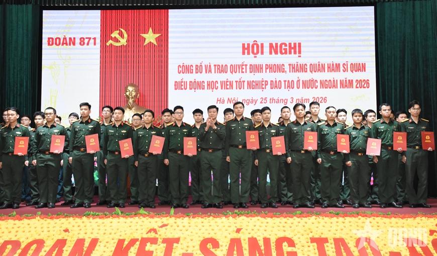 Sáng 25-3, Đoàn 871 (Tổng cục Chính trị) tổ chức Hội nghị công bố, trao quyết định phong, thăng quân hàm sĩ quan và điều động công tác đối với học viên tốt nghiệp đào tạo ở nước ngoài ra trường tháng 3-2026.