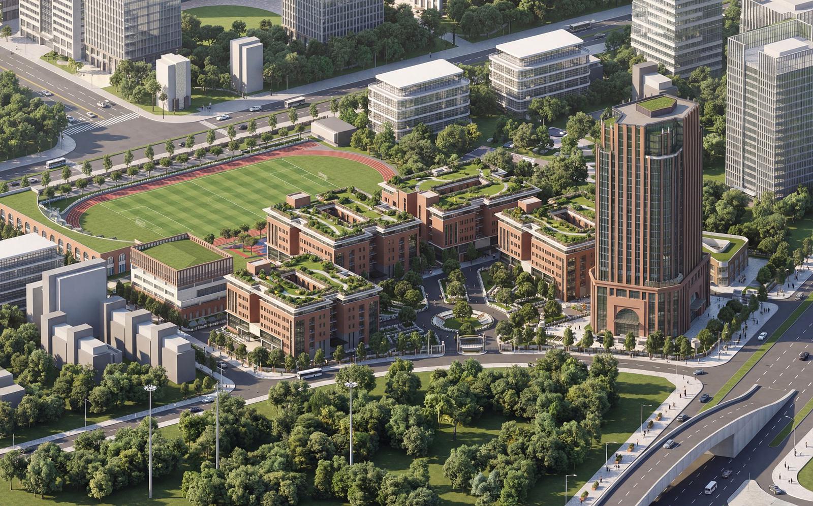 Toàn bộ khuôn viên được quy hoạch theo tiêu chuẩn cơ sở giáo dục hiện đại, tích hợp không gian học tập mở, phòng thí nghiệm, khu nghiên cứu và hạ tầng công nghệ phục vụ giáo dục số. Mô hình tổ hợp cho phép kết nối liên thông giữa các cấp học, tạo môi trường học tập xuyên suốt trong cùng một hệ sinh thái giáo dục.