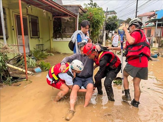 | Lực lượng cứu hộ sơ tán người dân khỏi khu vực ngập lụt do bão Kalmaegi tại tỉnh Cebu, Philippines ngày 4-11-2025. |